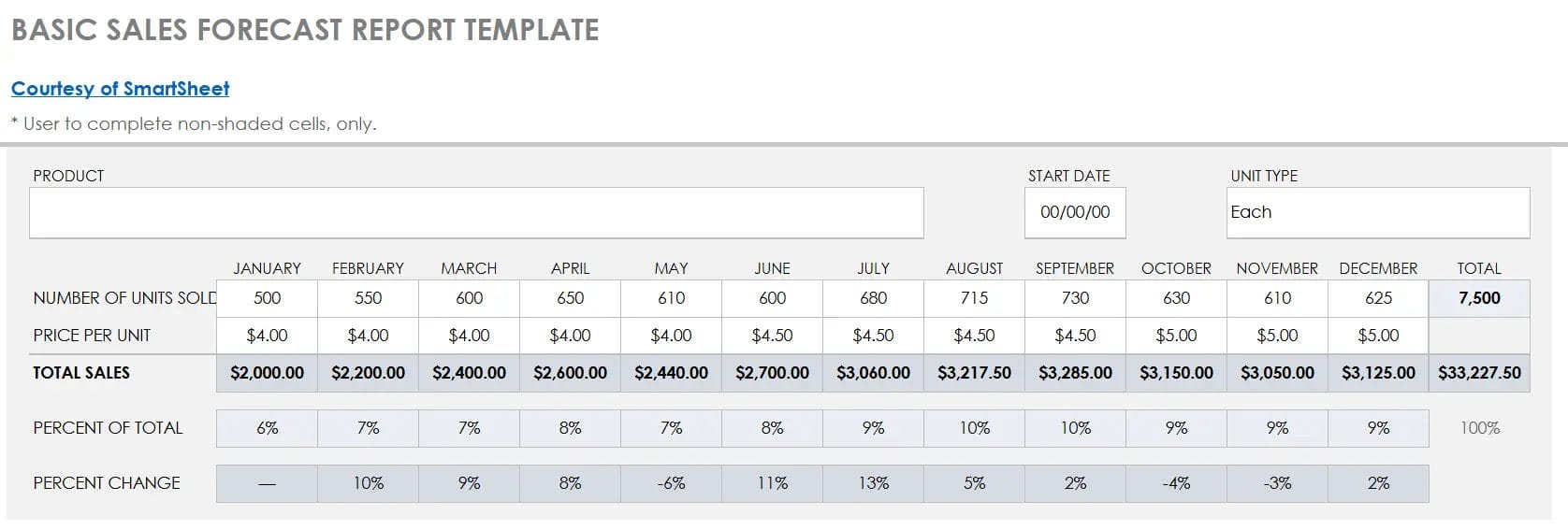 This basic sales forecast report template gives you a monthly breakdown of historical and prospective sales revenue. With this report, sales managers and teams can evaluate sales opportunities, lead assignments, sales pipeline stage success, and the likelihood of a won deal. It’s the perfect report template for income prediction and business goal setting.