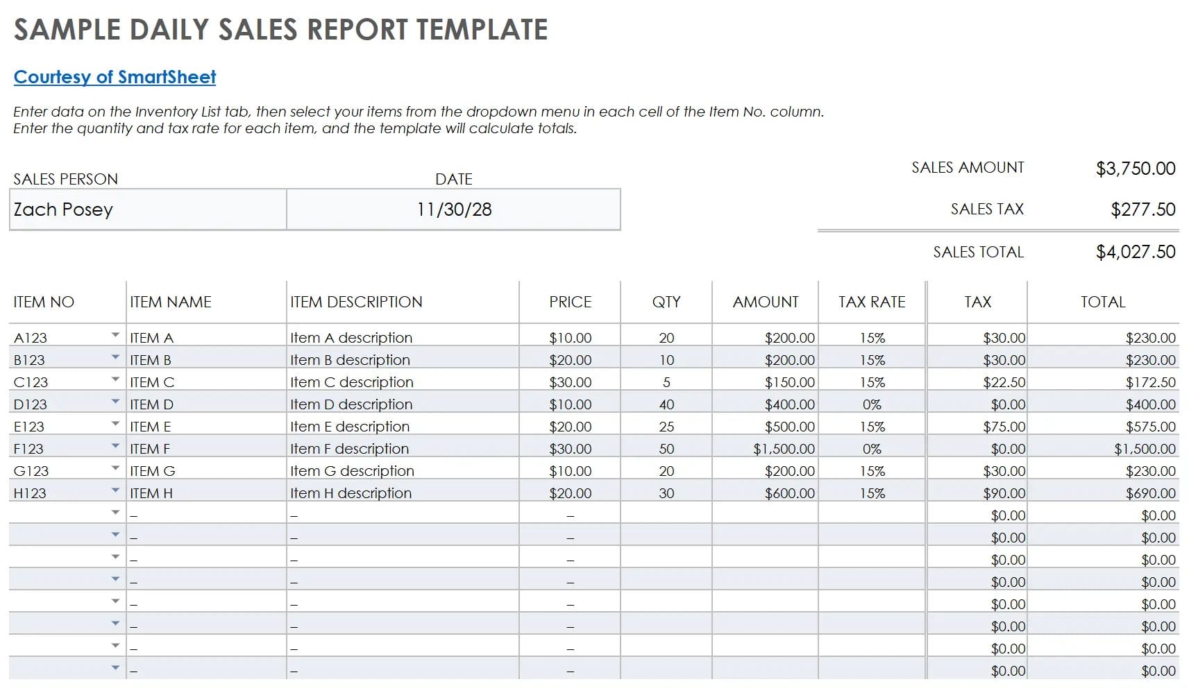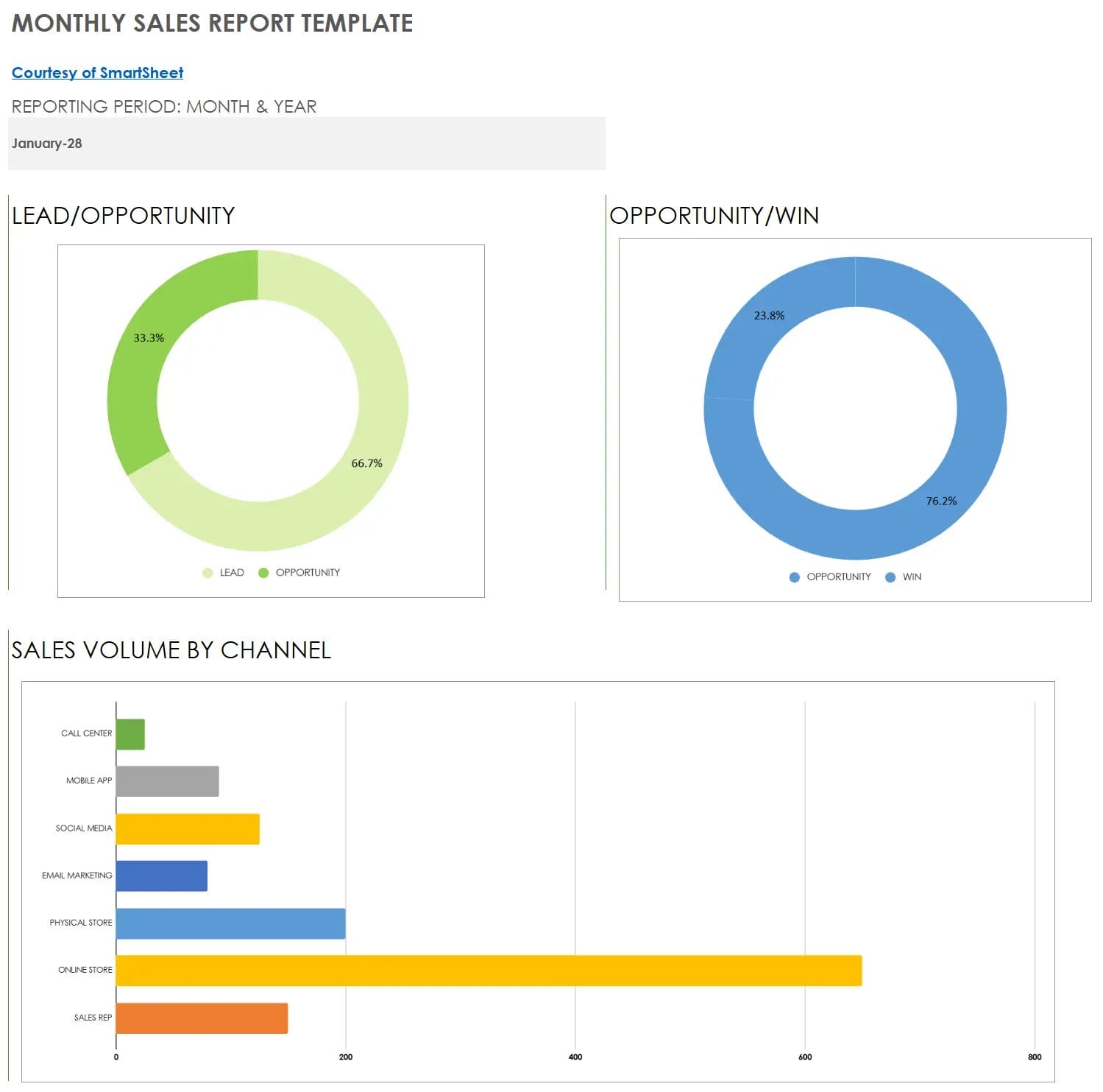 Sales directors and managers typically keep a master template for all the different types of sales reports they need to generate regularly. With a template on hand, there’s no need to build a new sales report from scratch each time you need to produce one.