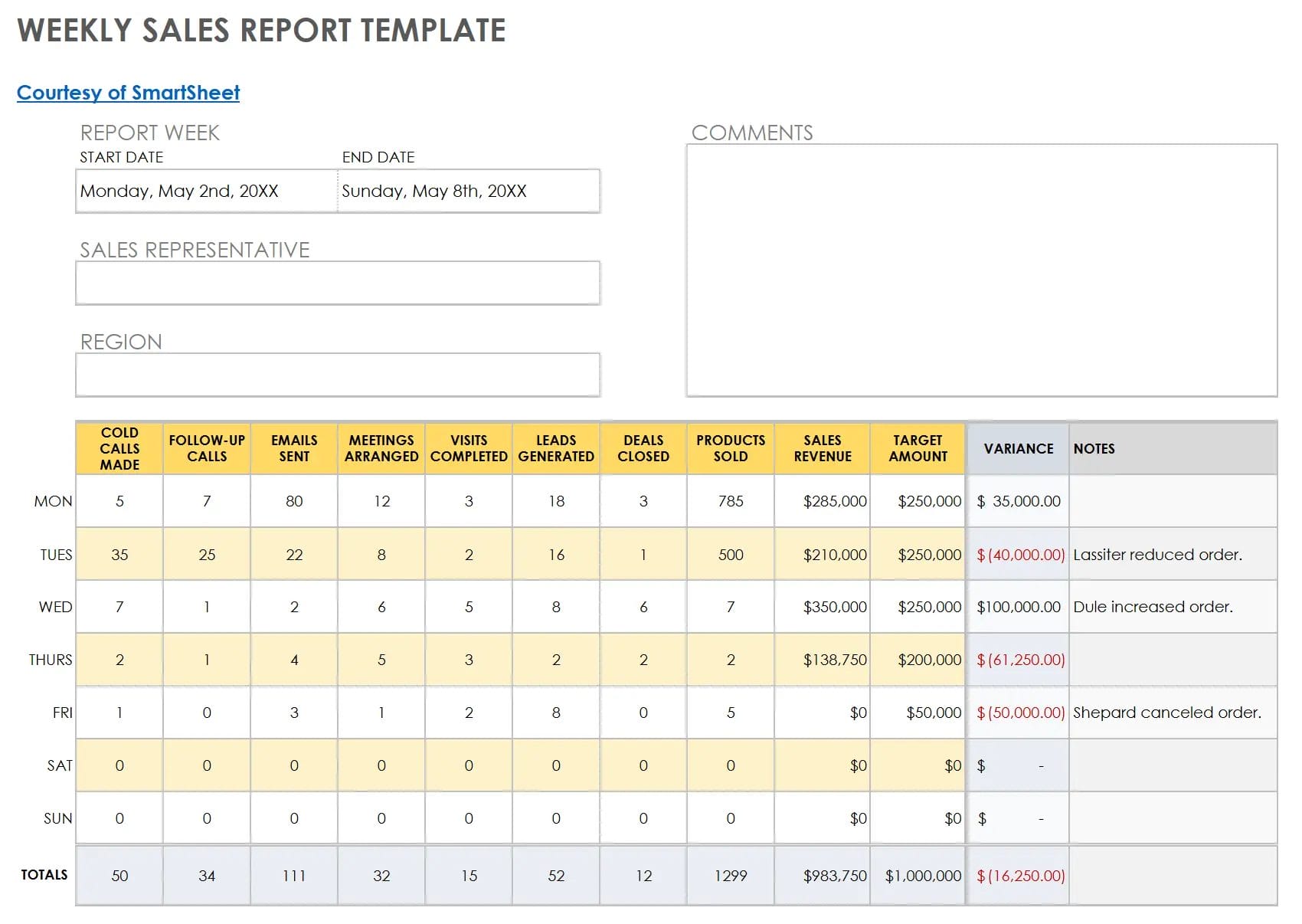 Who will use and view your completed sales reports—your CEO, VP, or sales reps? When building your template, think about who your sales report audience will be, and ensure you include the information they’ll want to see.